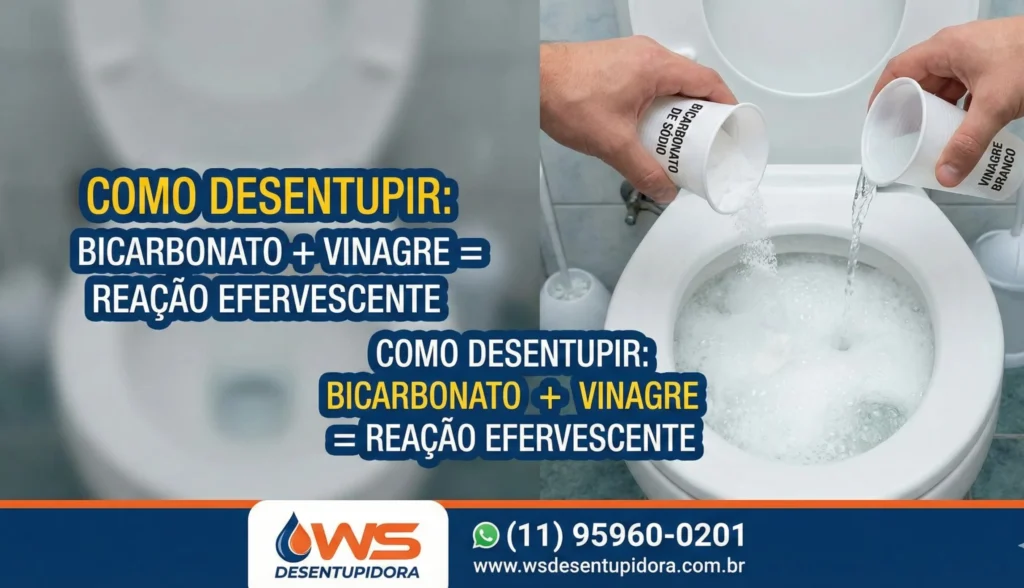 Bicarbonato + Vinagre — reação efervescente mais intensa que a da Coca-Cola. Dissolve resíduos orgânicos com mais eficiência. Método natural e seguro.